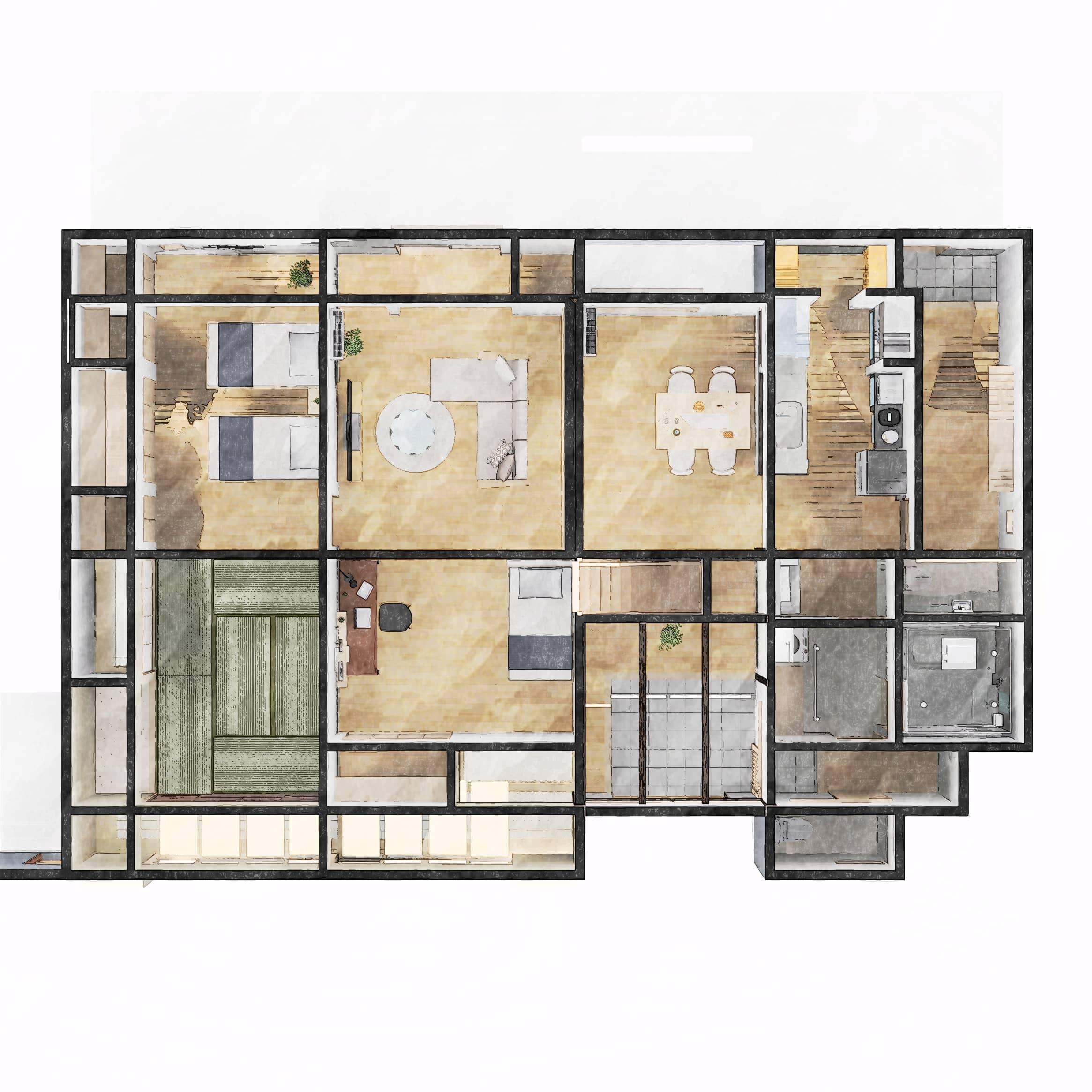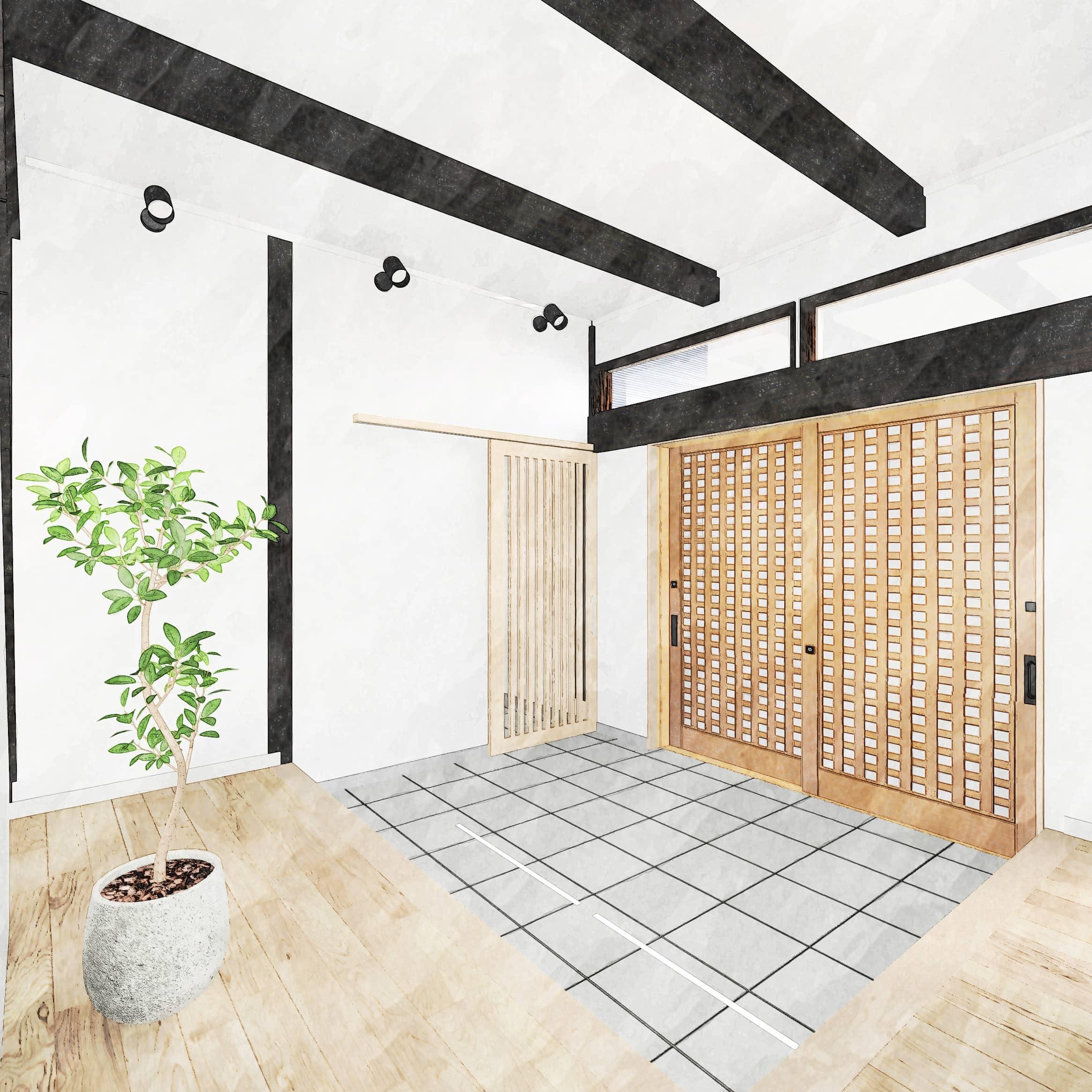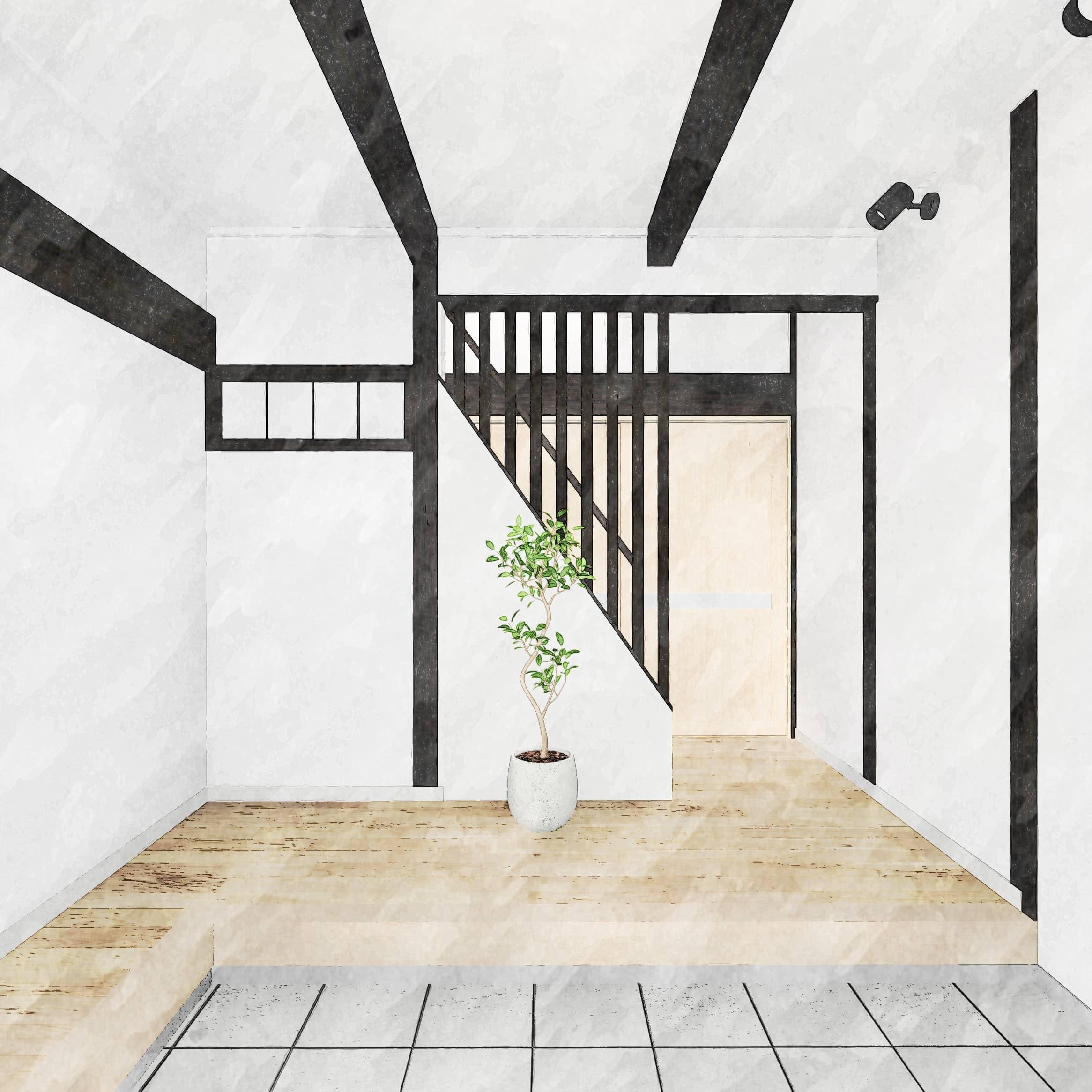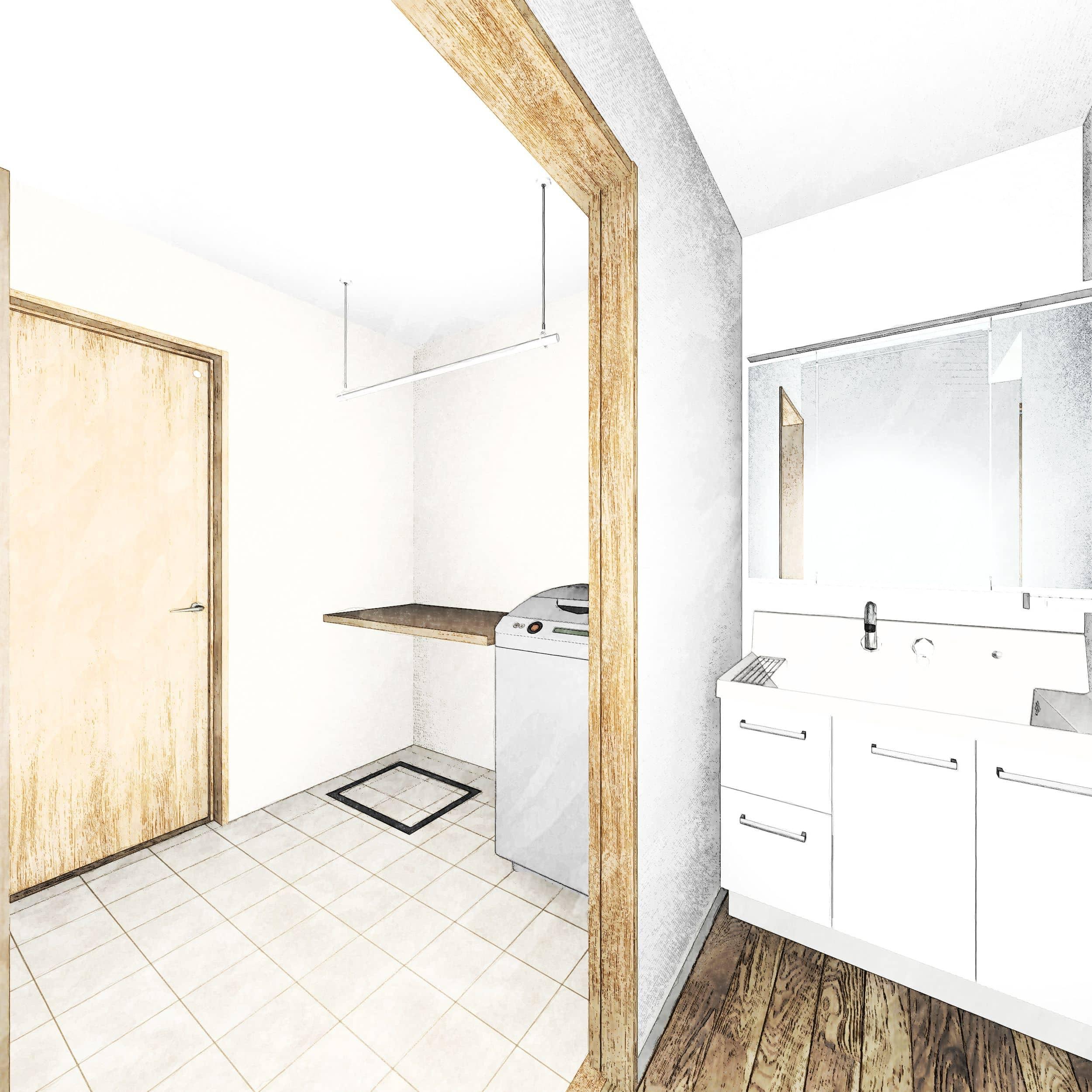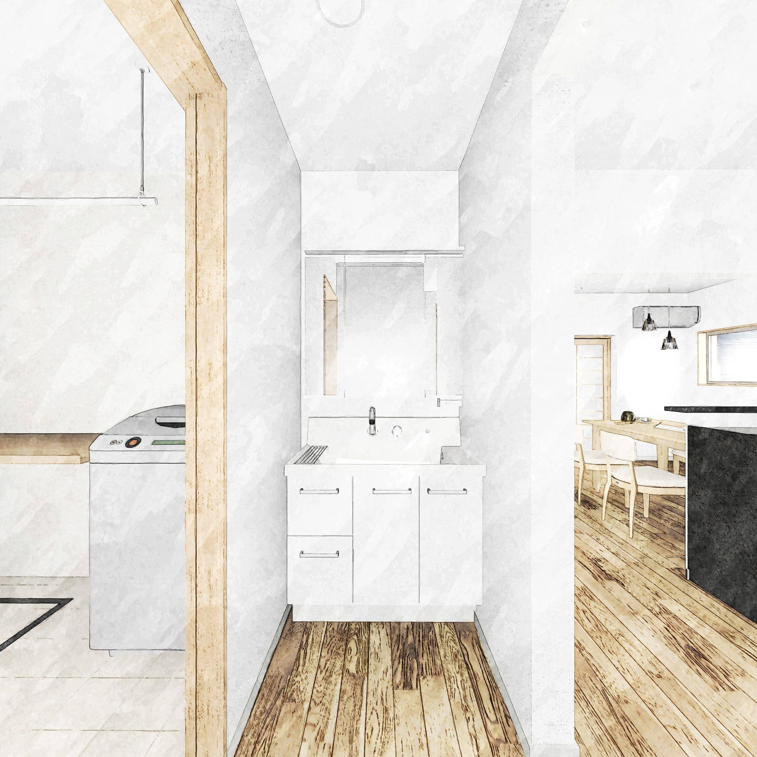 和の雰囲気を引き立たせる玄関は梁をあえて見せることにより空間に立体感とアクセントを与えます。生活の中心となる動線上にはWICや洗面コーナーを配置し、帰宅後すぐに手洗い・着替えができる、今の暮らしに寄り添った間取りになりました。