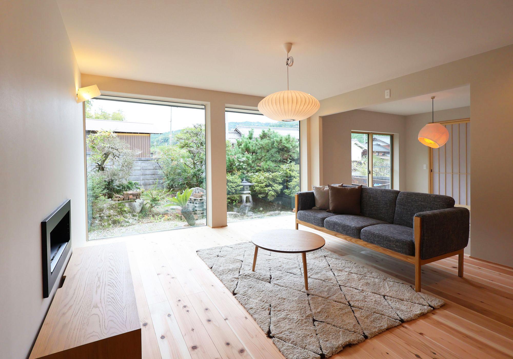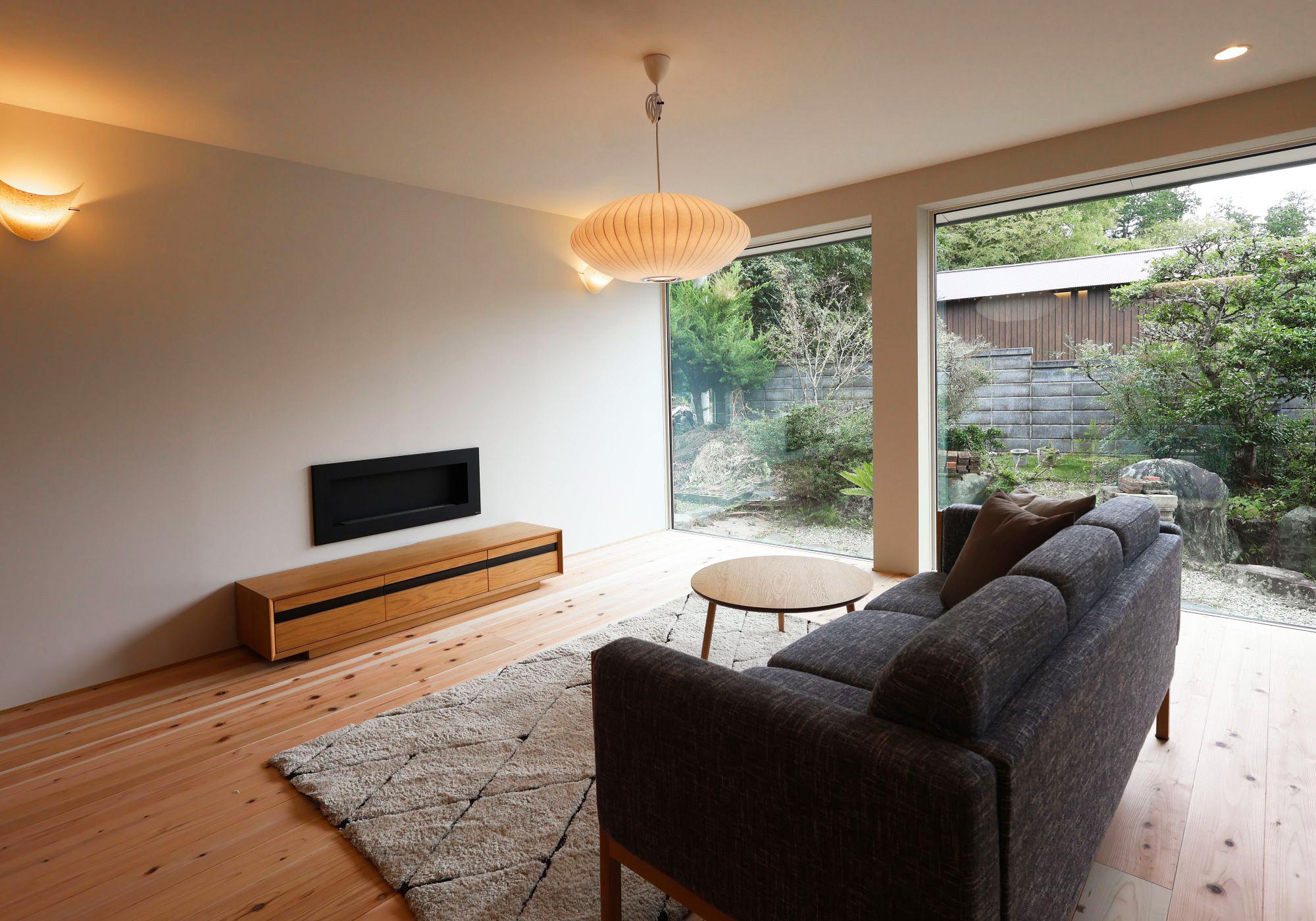 低めのニッチが視線を整え、洗練された印象を与える廊下に仕上がりました。絞り込んだ照明が展示物を際立たせ、上質な陰影を醸し出します。リビングは、エタノール暖炉の炎が視覚的なアクセントとなり、空間にやさしい温もりを与えます。柔らかな照明と白壁、無垢の床が織りなすコントラストが、上質なひとときを演出します。大きな窓からは光と緑を取り込み、季節のうつろいを感じることができます。