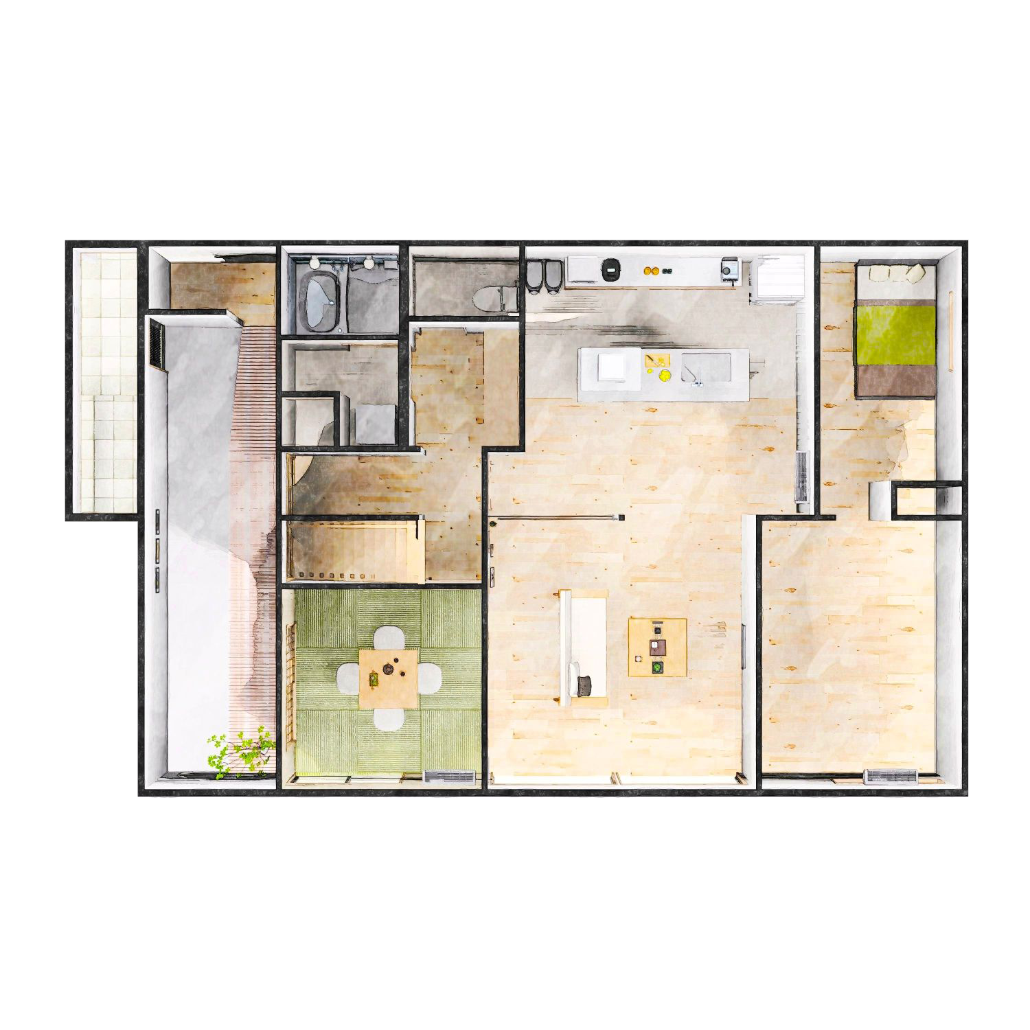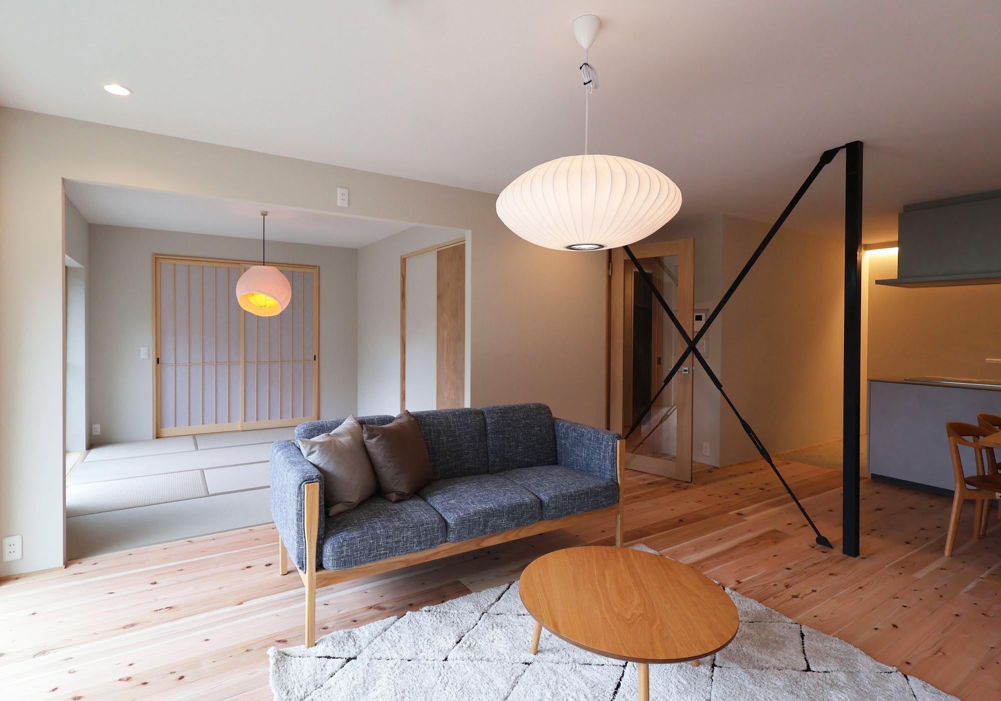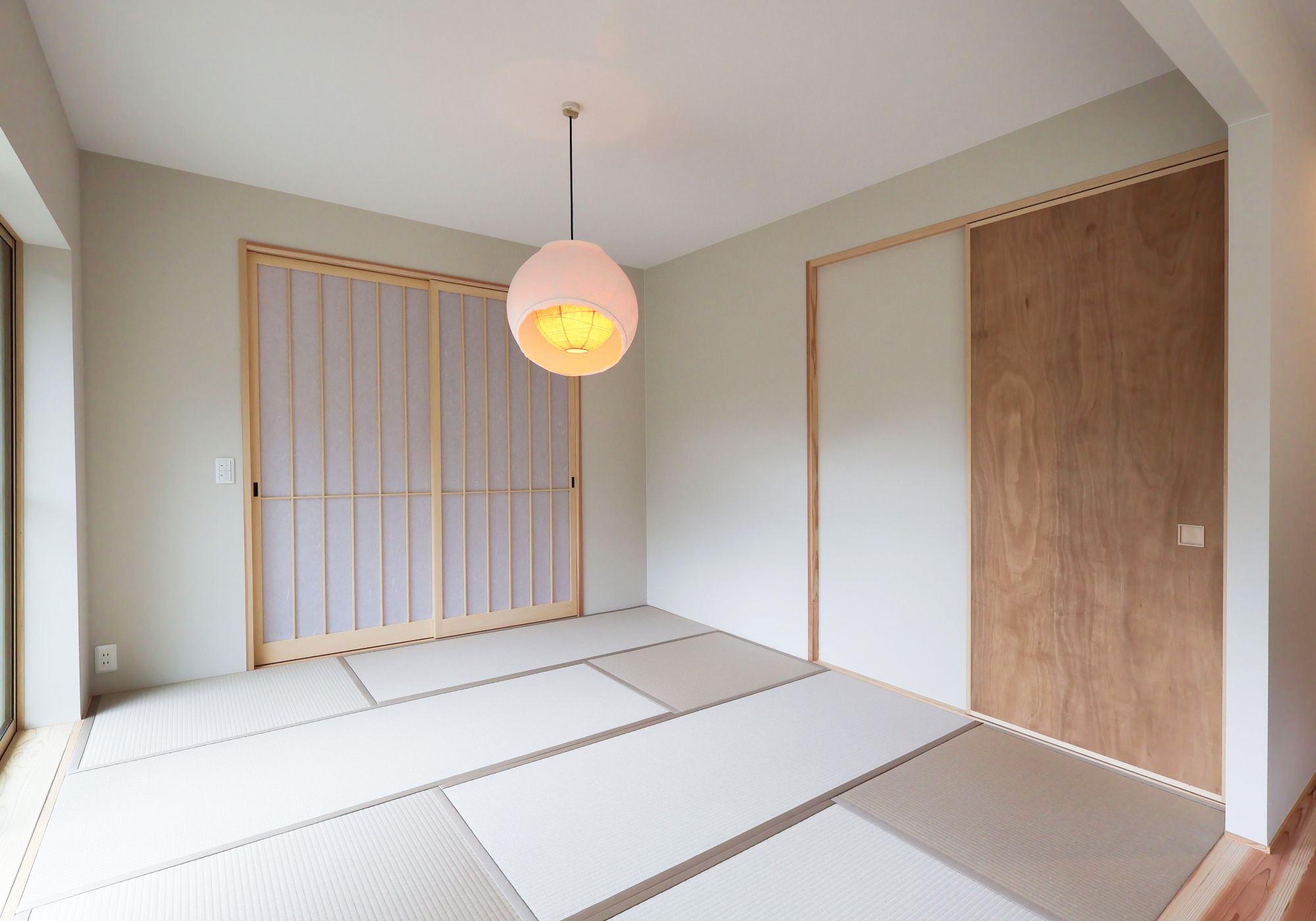 洗面は一枚板のカウンターに、陶器の洗面ボウルと黒の水栓で素材の魅力を引き立てます。加工を最小限にして“素材の力”を感じるデザインに仕上がりました。リビングとつながる和室は、家族の気配を感じながらも静かにくつろげる場所。玄関からも行き来が可能で来客を柔らかく迎える“もてなしの場”としても最適です。障子越しの柔らかな光が、時間とともに異なる表情を描きます。